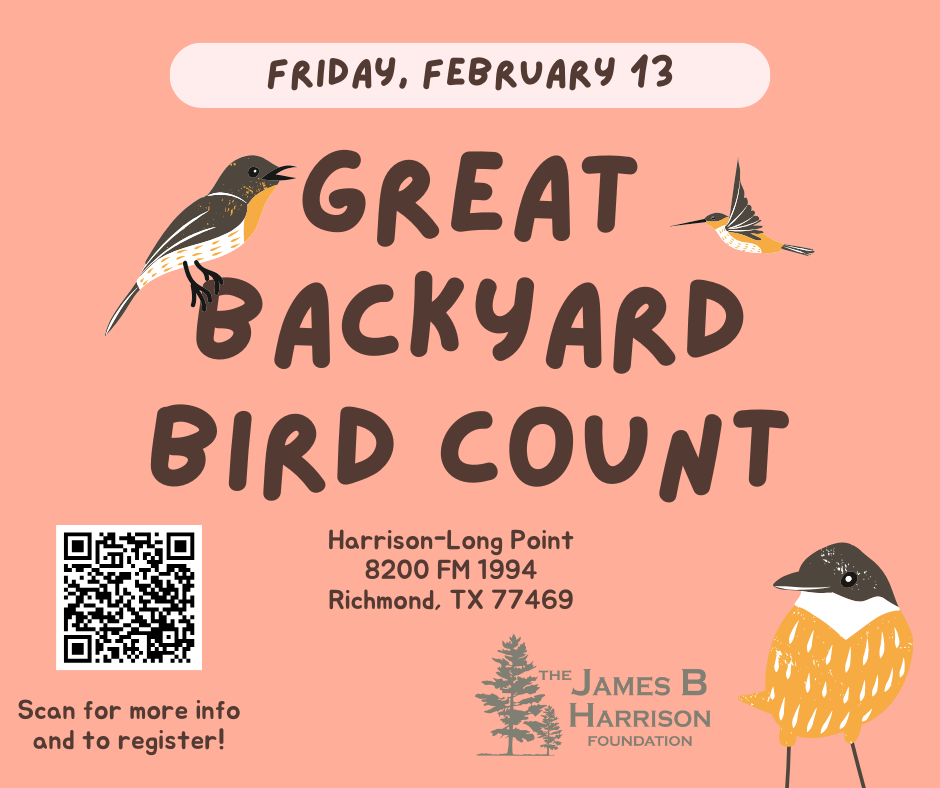 We welcome you to come join us for the 2026 Great Backyard Bird Count. This backyard count will be led by JBH Bird Leader and Texas Master Naturalist Erik Wolf.